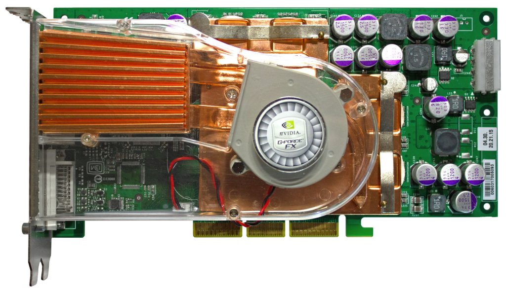 FX 5800 Ultra – cold air was sucked in through the PCI slot and then hot air was also pushed out through the PCI slot. Both the intake and outtake were positioned side-by-side. Unfortunately, the card turned out to be one of the loudest models in history. AD 2003